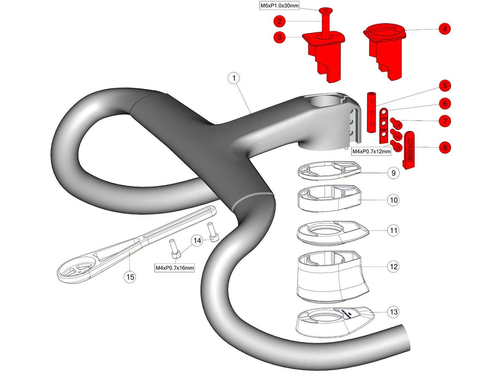Le kit comprend tous les composants de serrage du pivot de fourche pour un cockpit ICS Carbon Aero BMC avec capuchons.